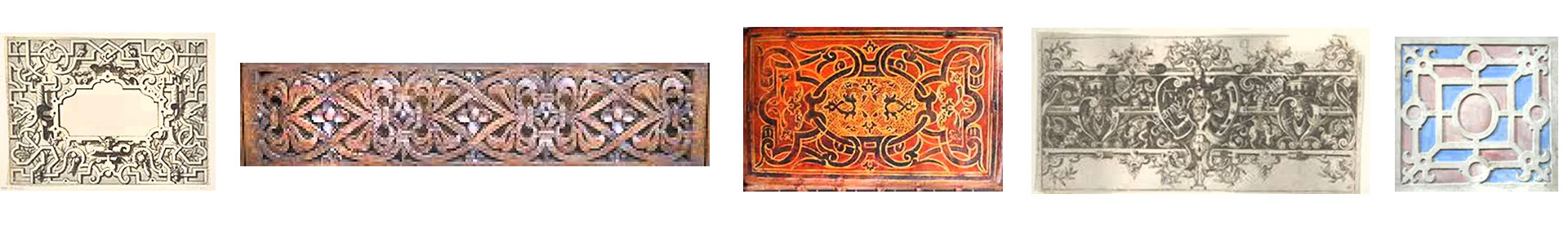 Ornamentation included high relief carving of animals and Classical busts… as well as tassels, scrolls, flowers and fruits. Strapwork was also used, generally on flat panels… strapwork being stylised ribbon-like forms imitating leather straps, parchment or metal, either pierced or interwoven into a variety of geometric patterns.
