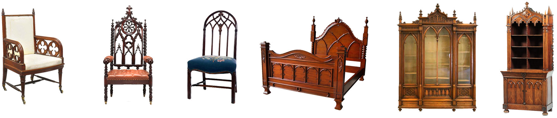 These pieces are relatively easy to identify as it’s one of the few styles that includes elements from original architectural structures into the furniture… in particular, Gothic architecture from the mid 1100s to the late 1400s… such as pointed arches, turrets, spiky pilasters (square columns), rosette motifs and quatrefoils (architectural designs of four lobes or leaves resembling a flower or clover leaf).