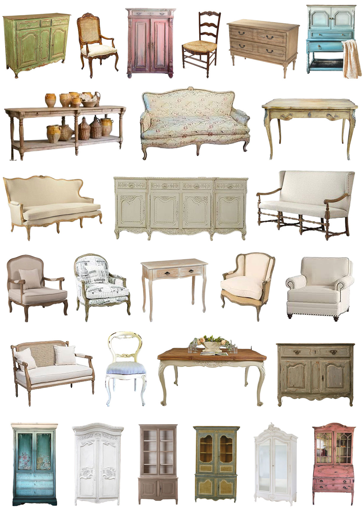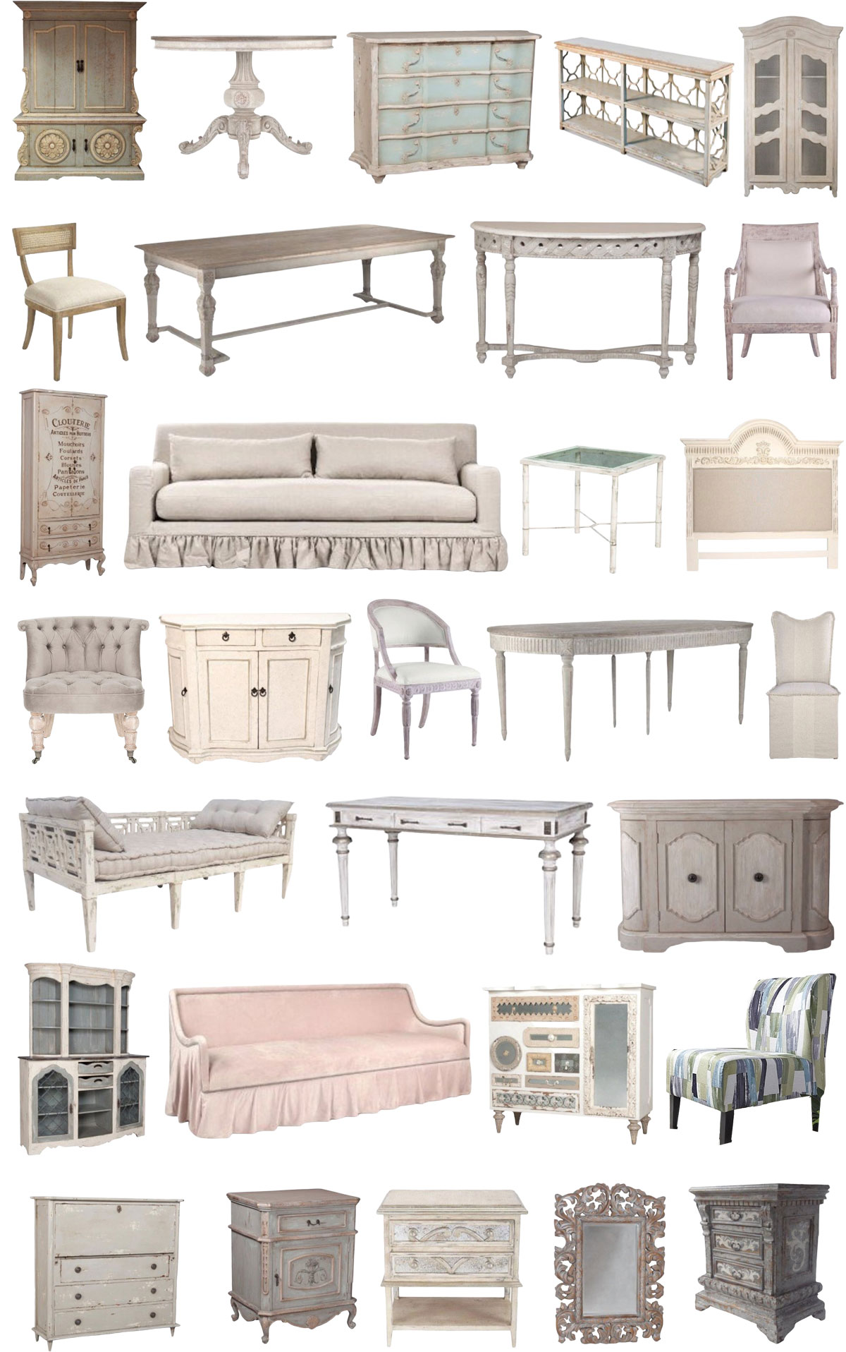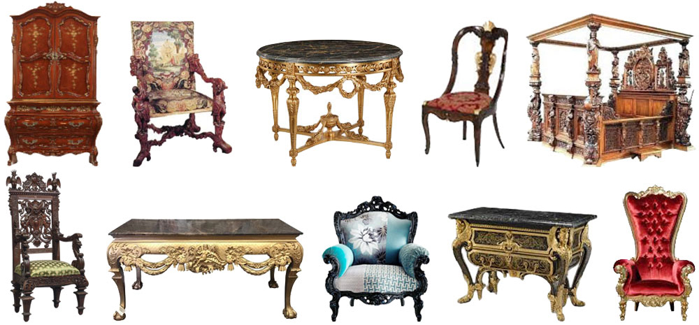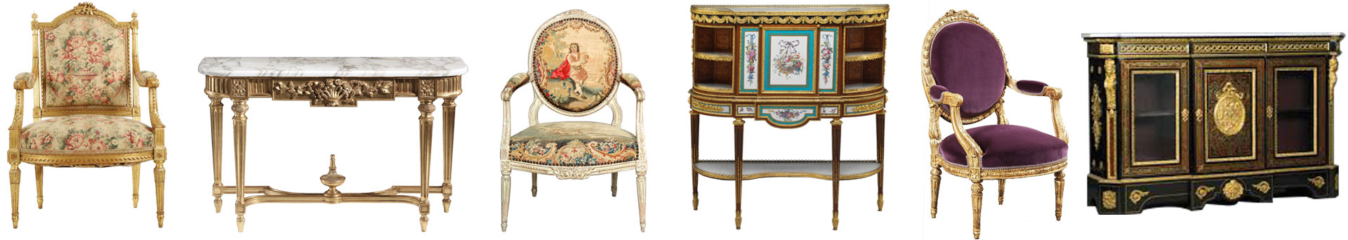 Despite the gilded and limewashed effects in the images below, most furniture of the era was made from expensive woods such as ebony, rosewood and walnut… with even darker woods sometimes being used to contrast the lighter ornamentation.