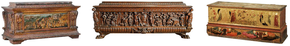 Dark woods were used, usually mahogany or walnut, with accents in rosewood and ebony… walnut being the preferred wood as was used in the 1500s, and this was probably the most accurate observance of the style to the original Renaissance.