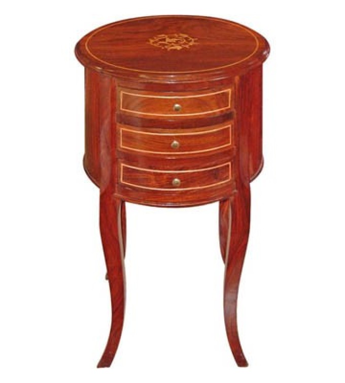 A traditional drum table made from solid Rosewood with three drawers and featuring brass fittings and wooden inlays.