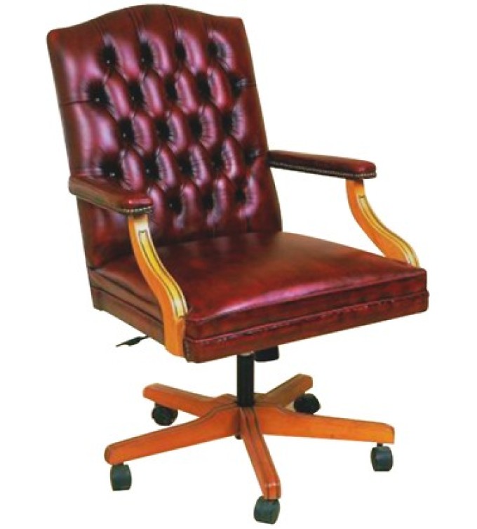 A deep buttoned, high back desk chair with wooden upholstered arms