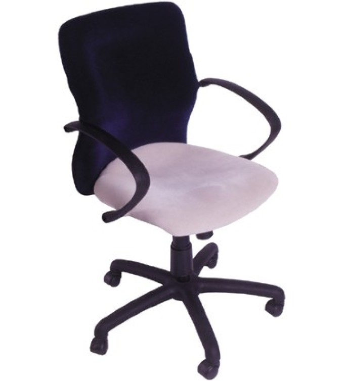 A contemporary typist chair with upholstered seat and back with plastic moulded arms. It is on five star base with castors and has a gas lift for variable heights.