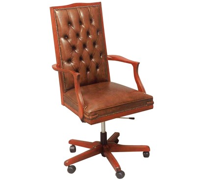 A deep buttoned, high back desk chair with wooden upholstered arms on a five star castor base with s..