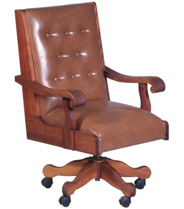 A deep buttoned, high back desk chair with lumbar support and wooden upholstered arms on a five star..