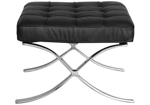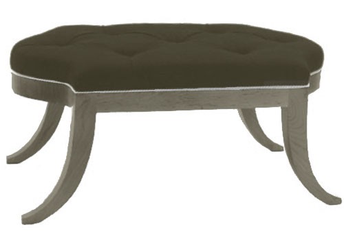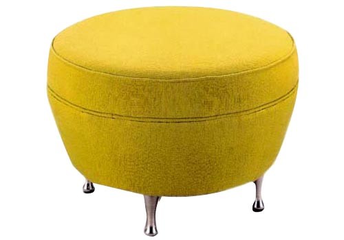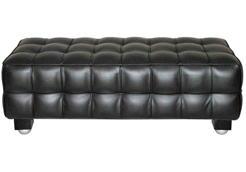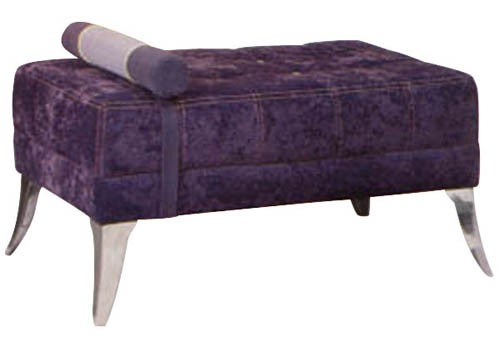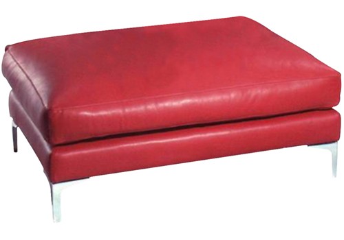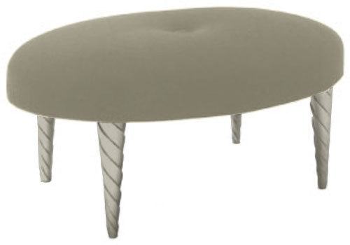 A contemporary ottoman with optional deep buttoned upholstery, curved stainless steel legs and a rem..