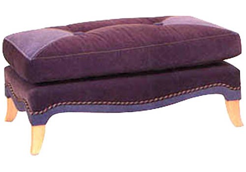 A traditional rectangular ottoman with a deep buttoned top and a fully upholstered base with bullion..