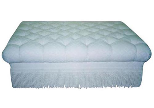 A large rectangular ottoman with a deep buttoned top and wooden legs...