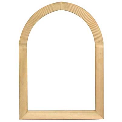 A classical mirror frame with an open angled top and double fluted columns along its sides...