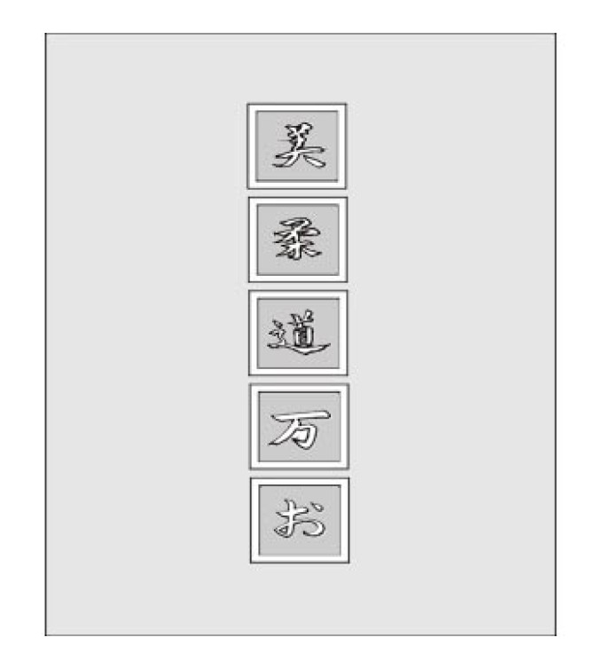 A simplistic row of five squares each containing a different eastern motif, shown in grayscale, but available in any combination of colors and in any size or shape