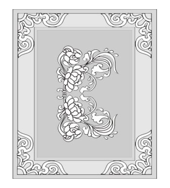 A central floral emblem set into a rectangular border with corner motifs, shown in grayscale, but available in any combination of colors and in any size or shape