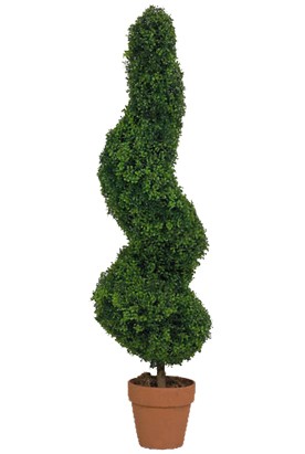A 1.5 metre spiral box wood with silk foliage shaped into a sculptured topiary. Supplied ready plant..