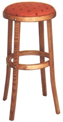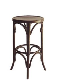 A bentwood bar stool with a circular wooden seat and integrated foot rail...