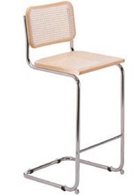 A Marcel Breuer bar stool with a framed webbed cane seat and wide back on a cantilever chromed frame..