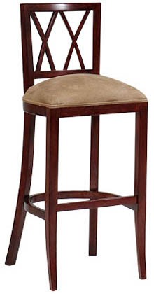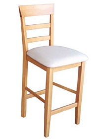 A simplistic bar stool in cherry wood featuring an upholstered seat and ladder back with leg stretch..