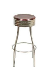 A retro styled diner bar stool with a concave wooden seat on a chrome frame...