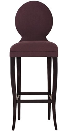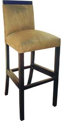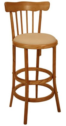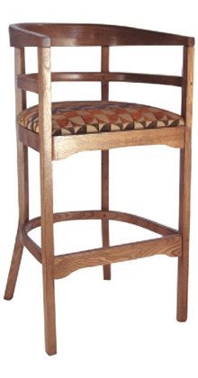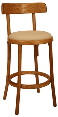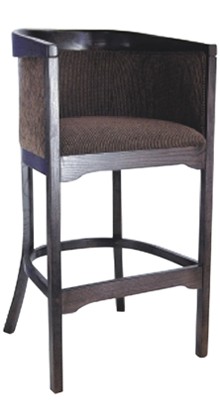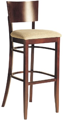 A simplistic bar stool in cherry wood featuring an upholstered seat and curved back with leg stretch..
