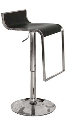 A modern bar stool with a pressed black leather seat on a tubular chrome frame...