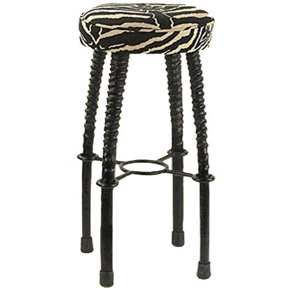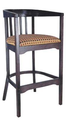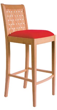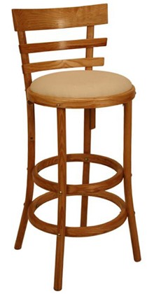 A contemporary bar stool with a wooden frame and horizontal laddered back...
