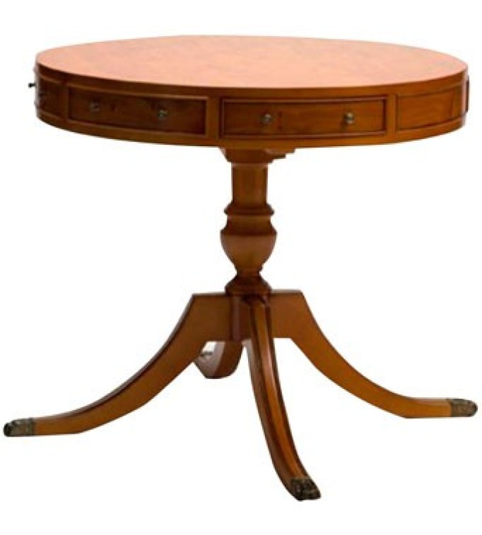 A circular table with drawers and a gilded leather inlay on a pedestal base with brass foot caps.