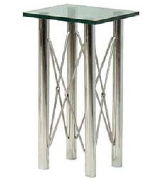 A display podium with tubular stainless steel legs and criss-cross detail.