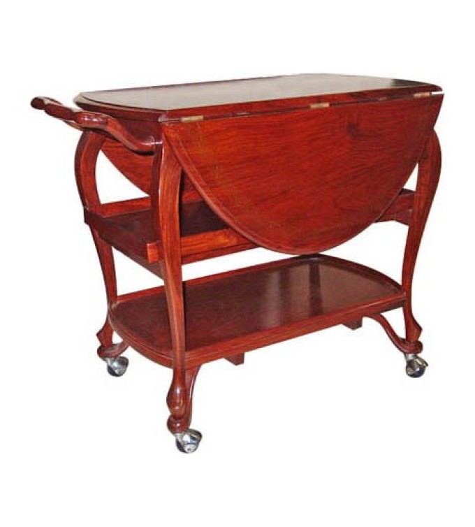A traditional Victorian oval tea trolley made from solid Rosewood featuring a flip-down table top.