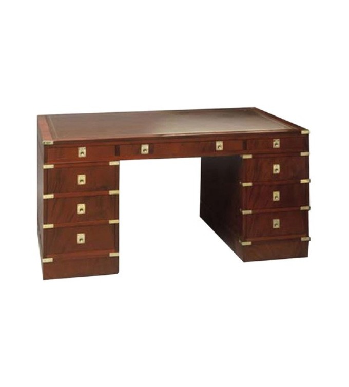 A double pedestal, nine drawer desk with gilded leather inlay and military fittings.