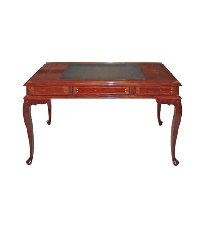 A traditional Victorian desk made from solid Rosewood and featuring carved detail and brass fittings as well as a leather pad inlay.