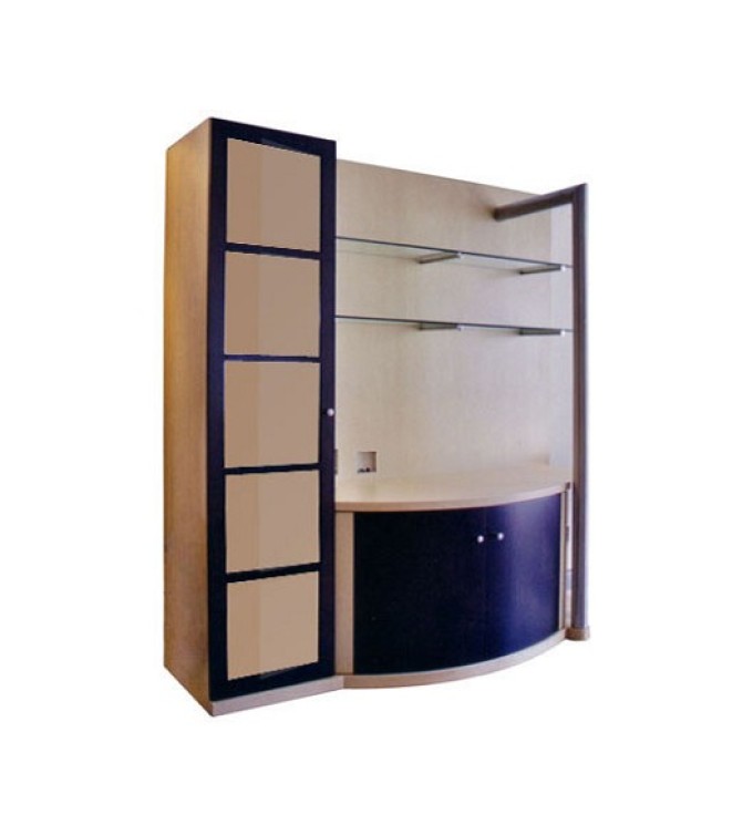 and a curved television cupboard with glass shelves for audio / video equipment.