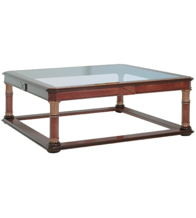 An elegant coffee table with an inlaid glass top, decorative medallions centered on the top rails and fluted carvings adorning the corner columns. Available in various shapes and sizes.