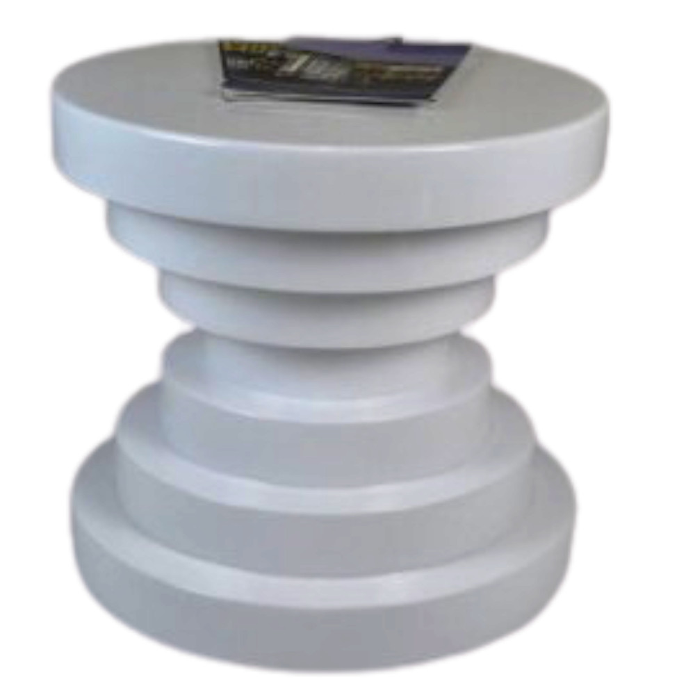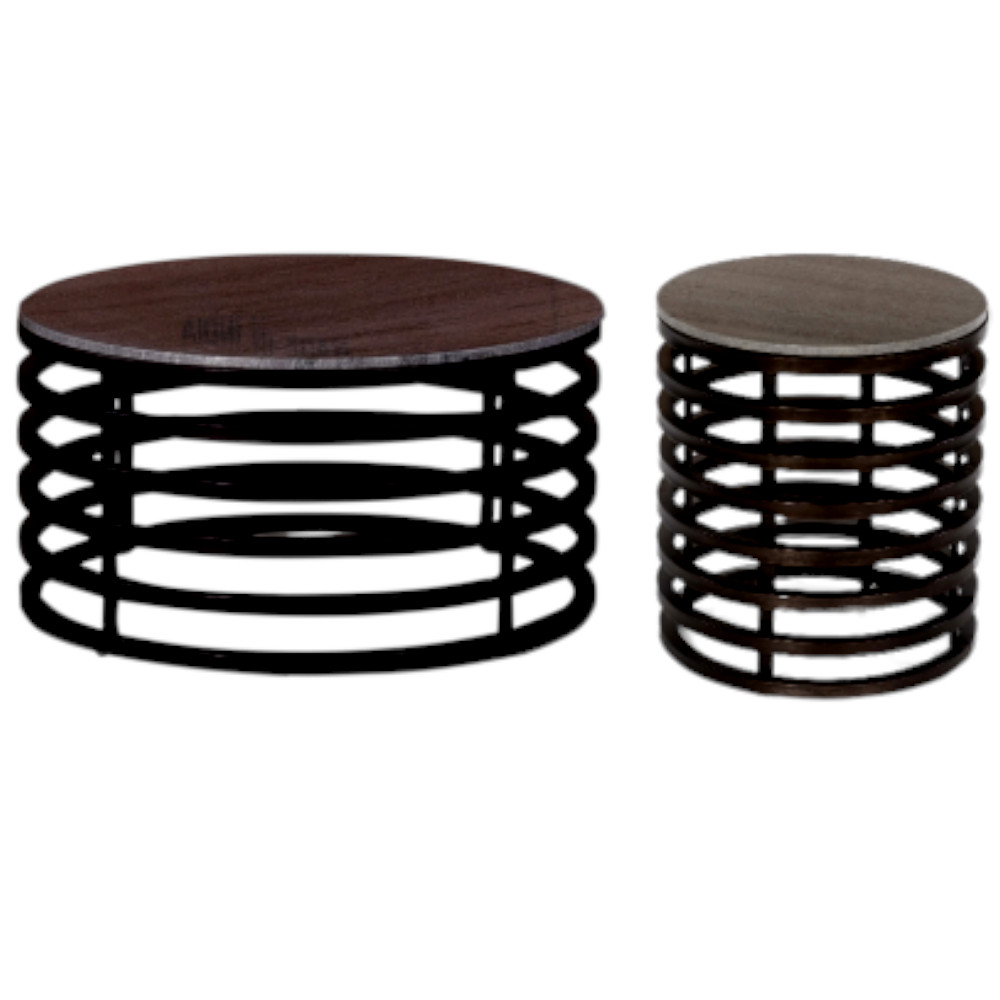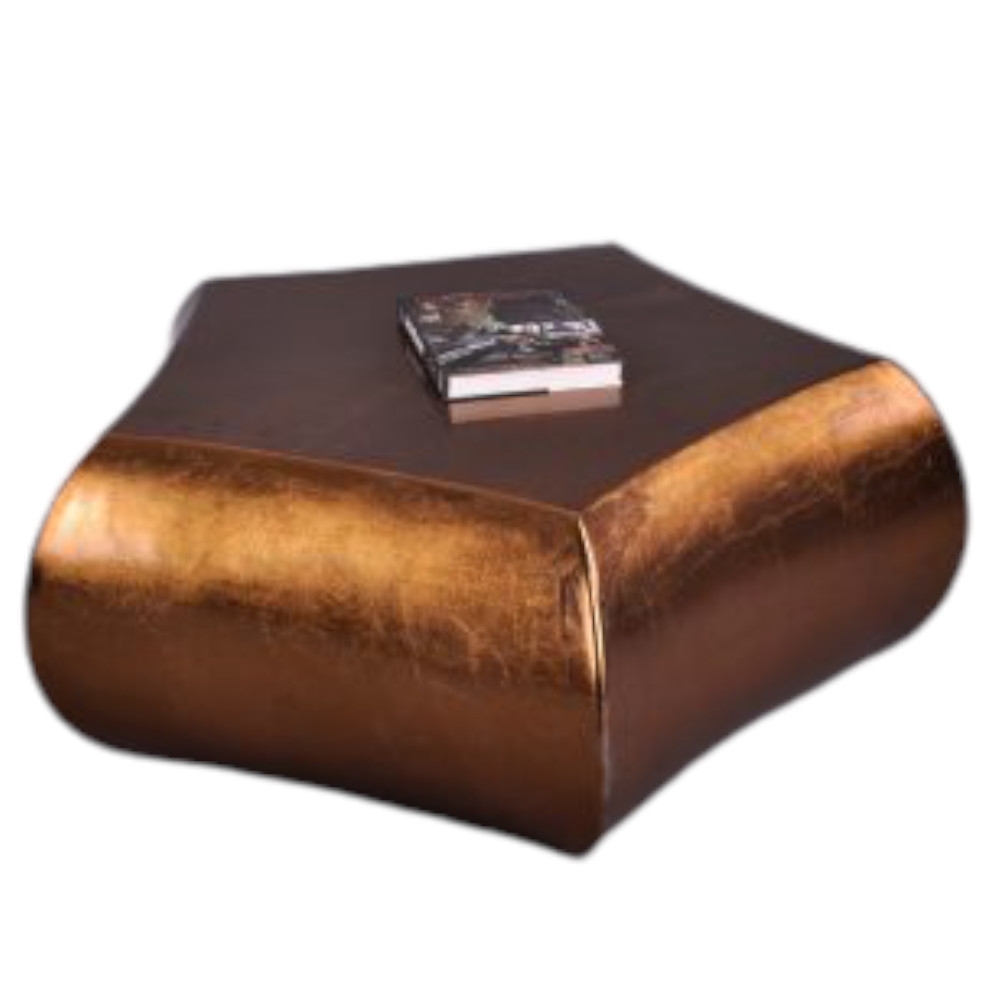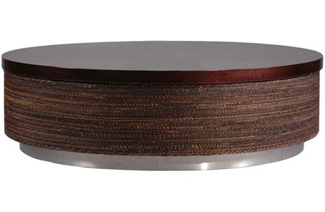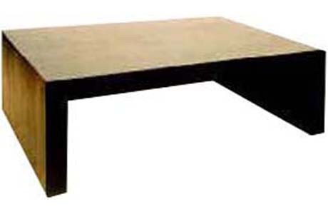 A large wafer like coffee table with a chunky base and top separated by chromed pins and a cut-back ..