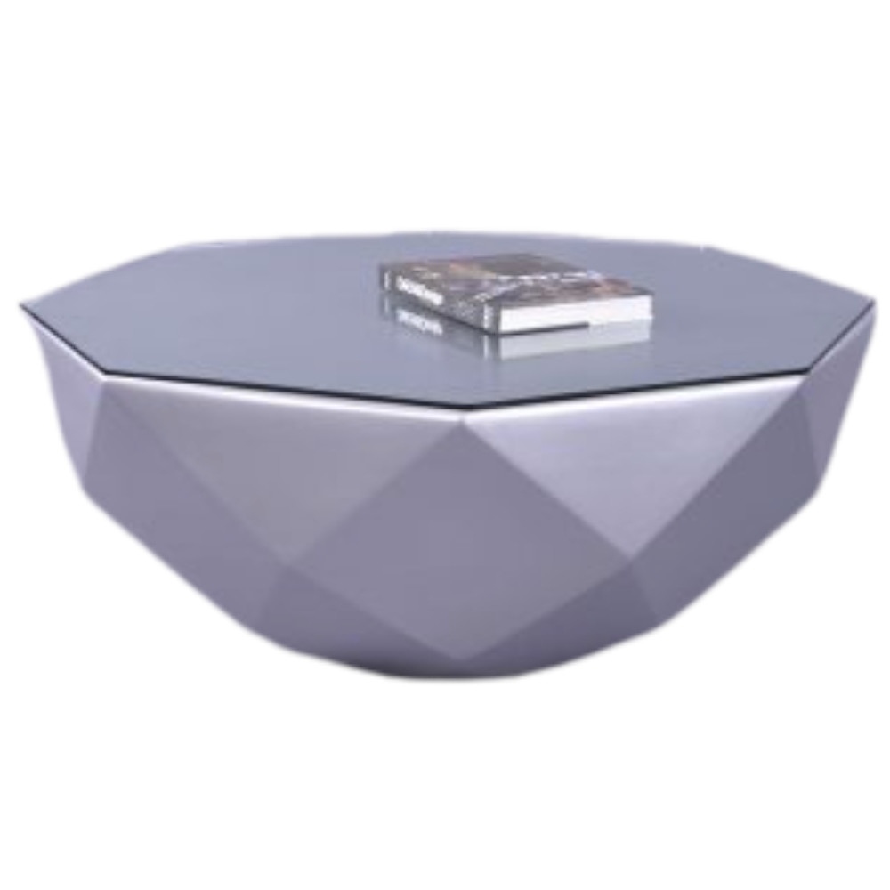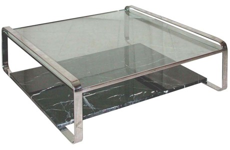 A large coffee table with chunky stainless steel legs and a glass top recessed into a metal frame...