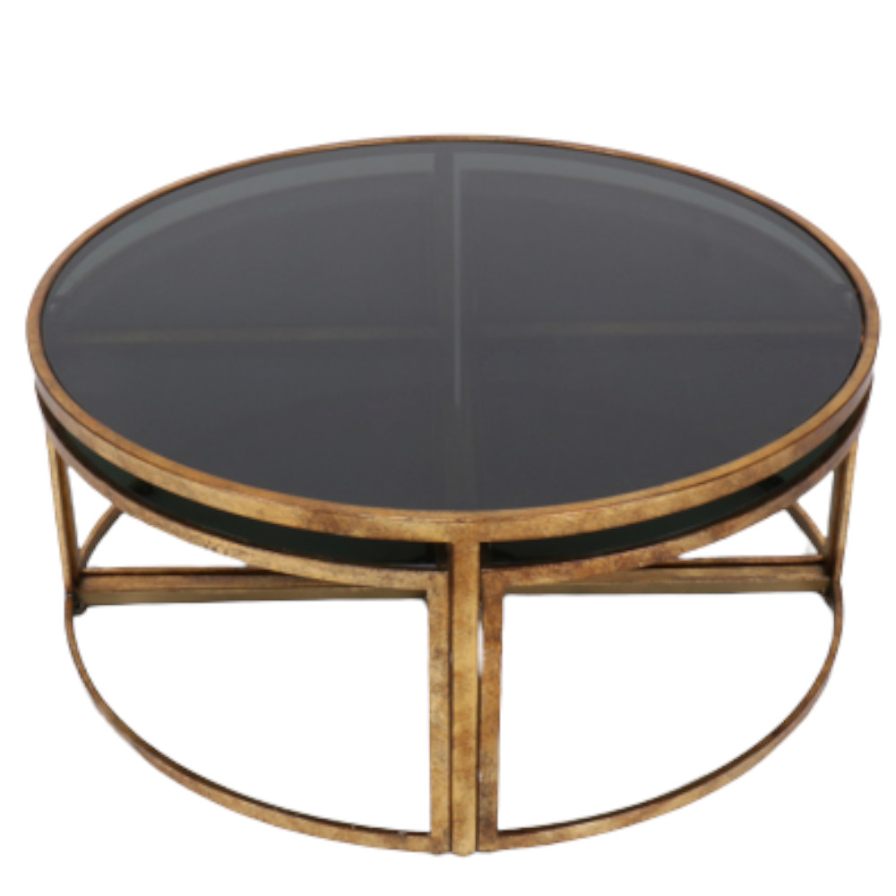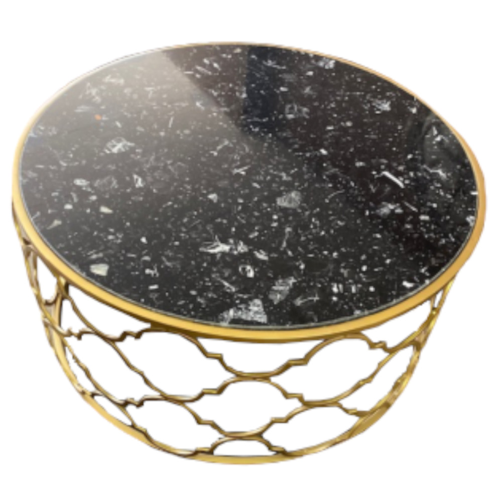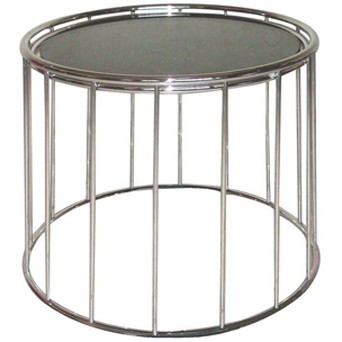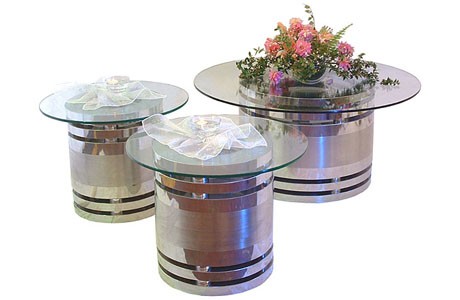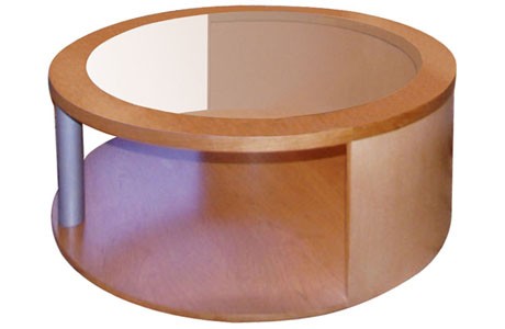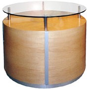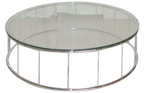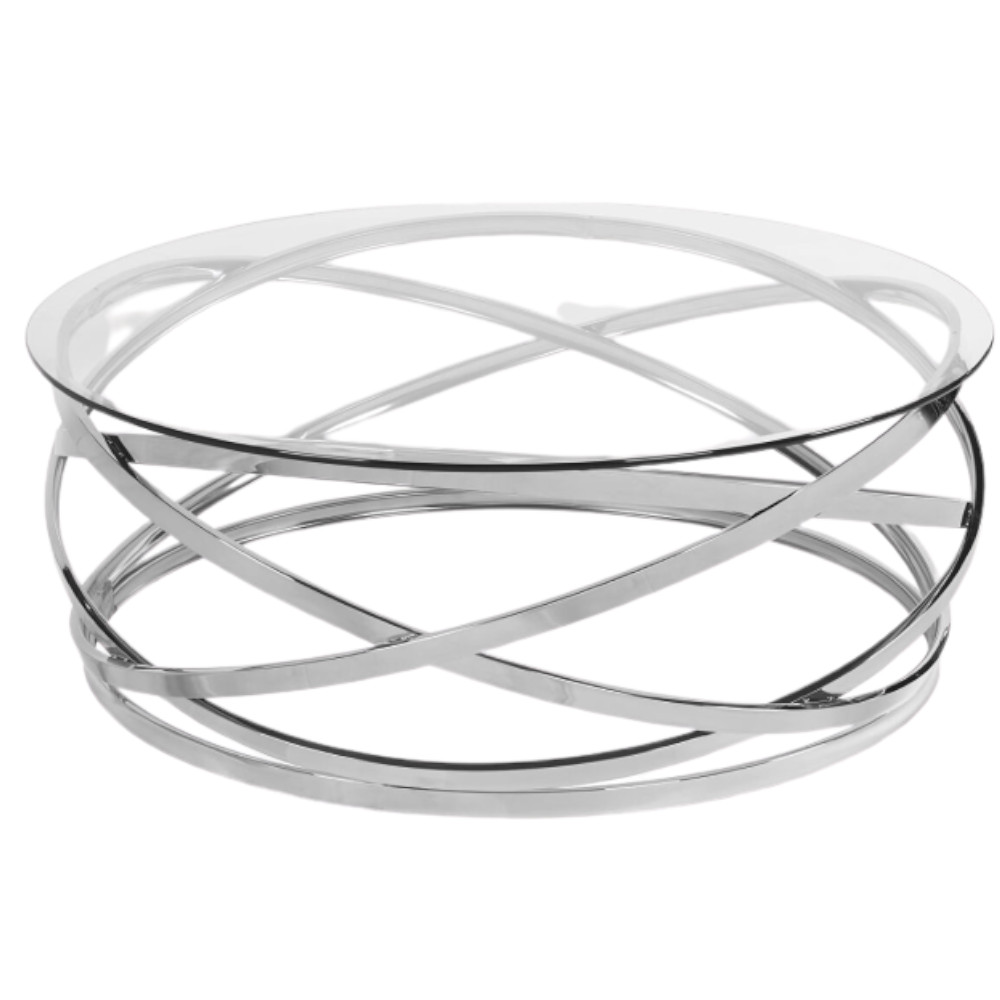 A circular coffee table with an encapsulated glass top floating above a stainless steel column...