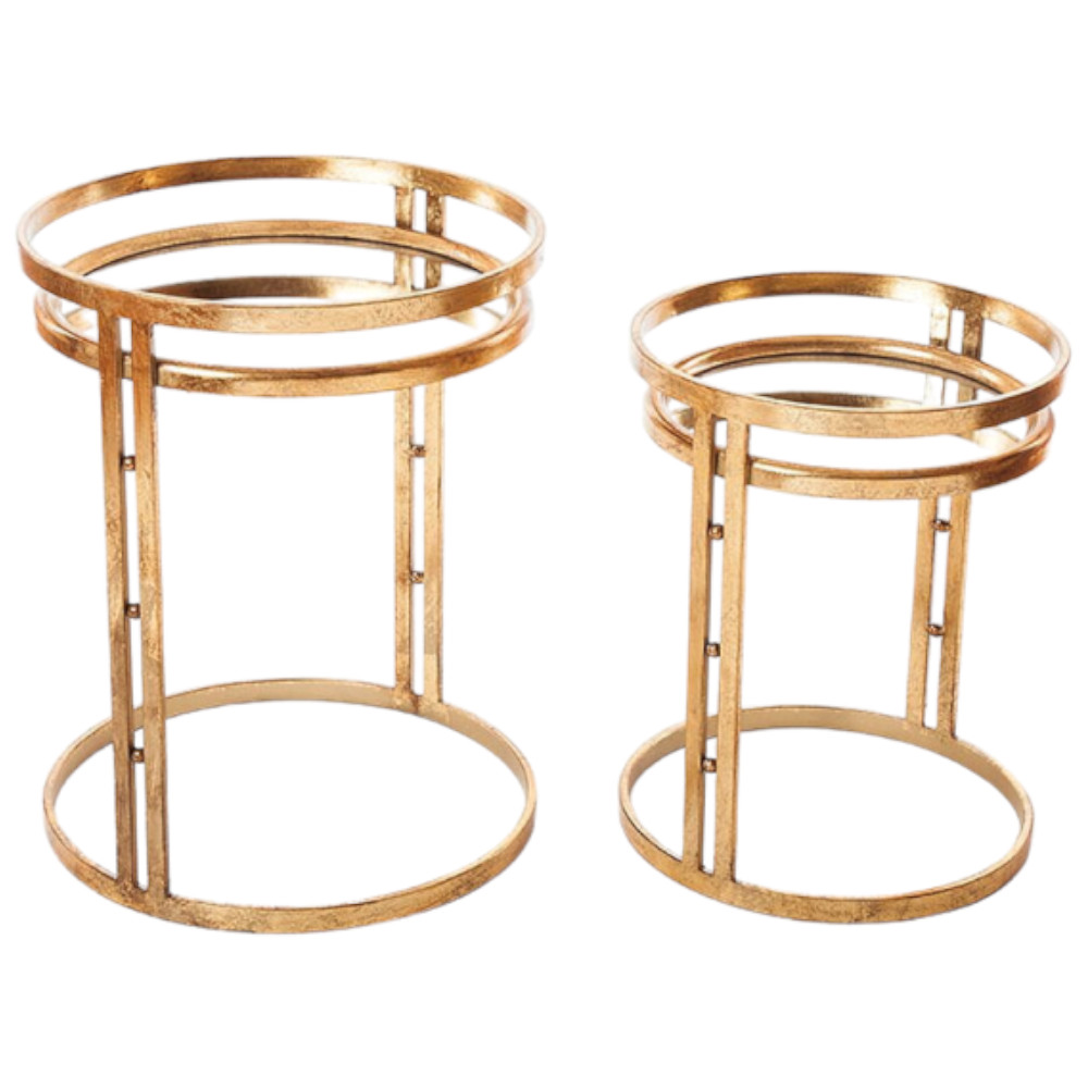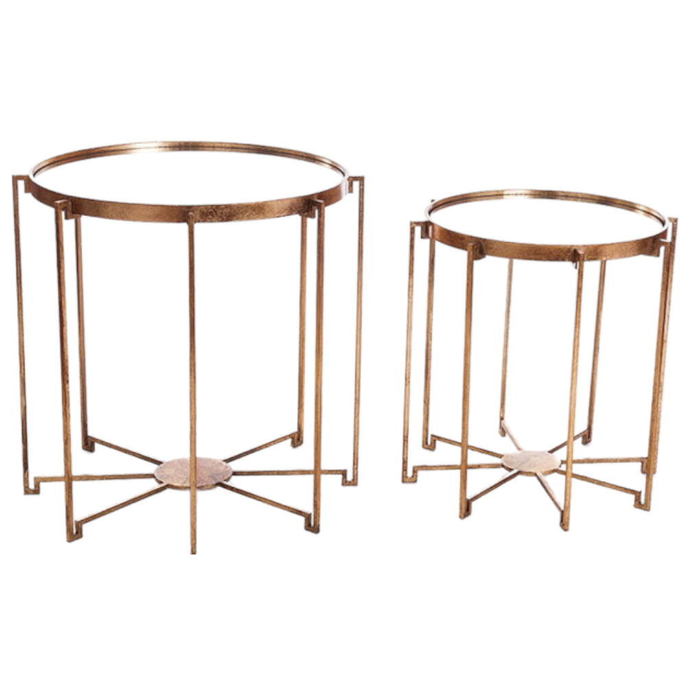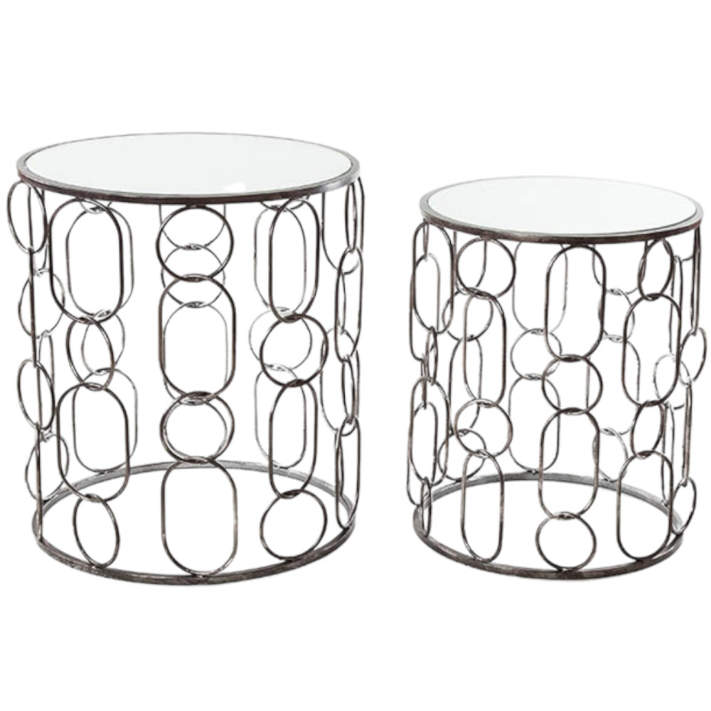 A circular coffee table with an encapsulated glass top floating above a stainless steel column...
