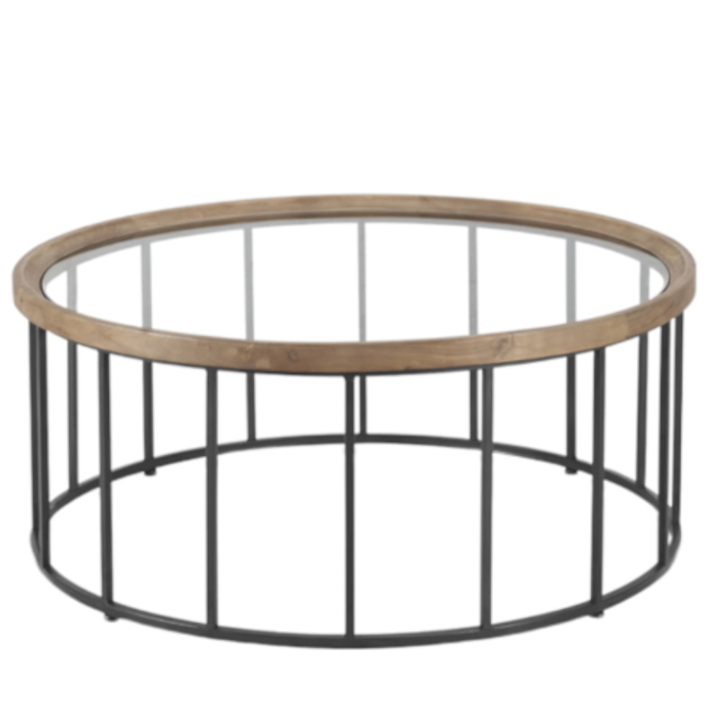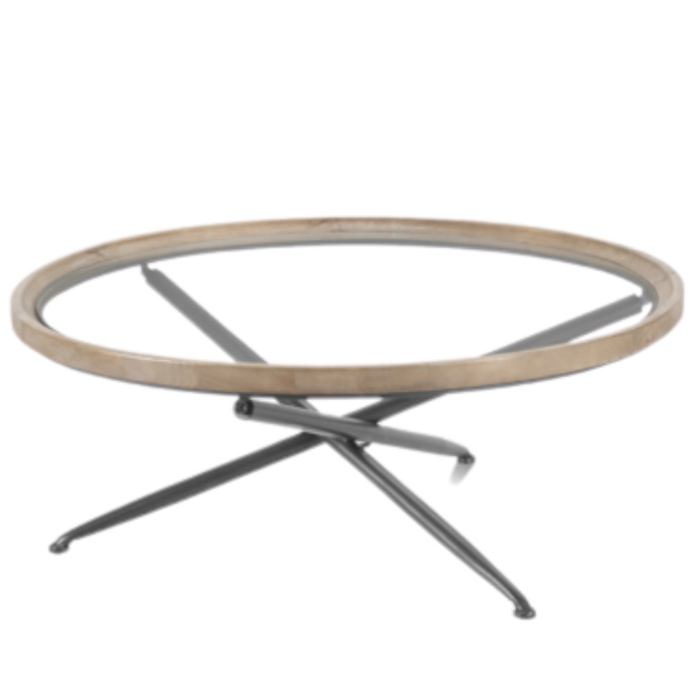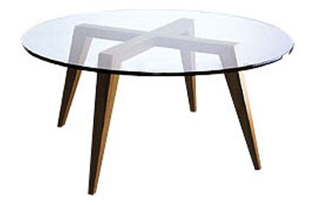 A circular coffee table with a wooden criss-cross base and a floating glass top...