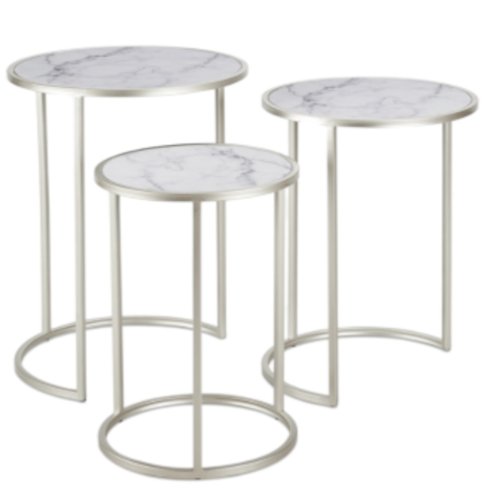 A coffee table with a free-form glass top and three circular stainless steel legs with floating ring..