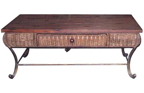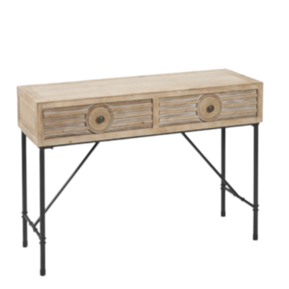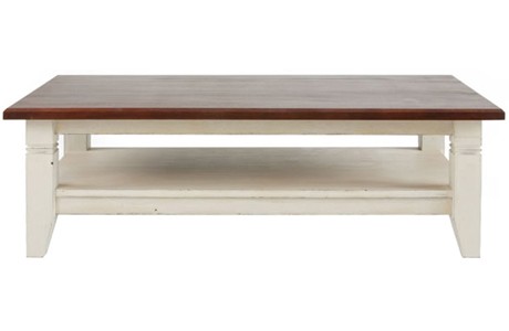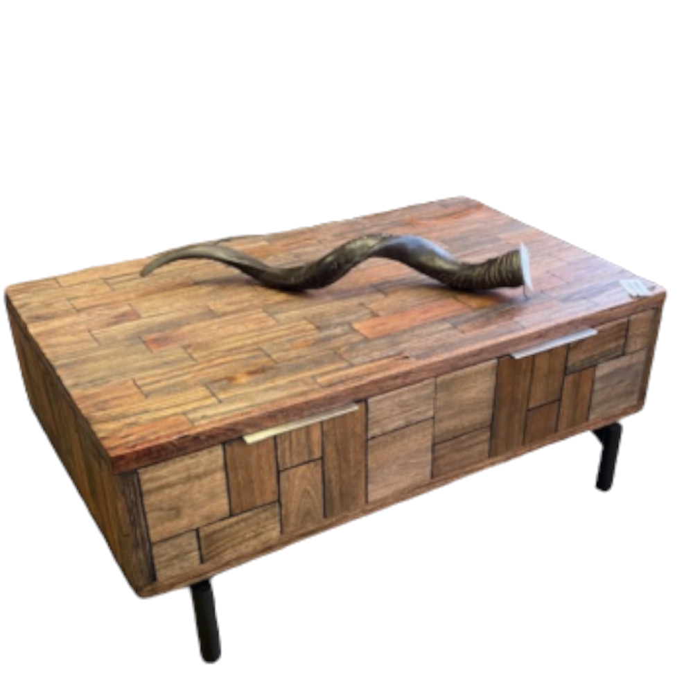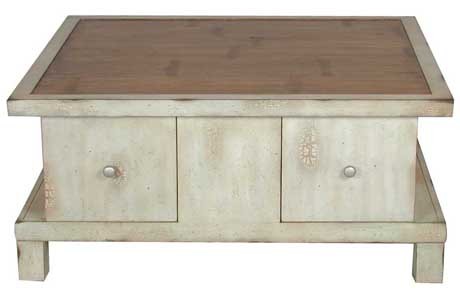 A simplistic coffee table with two deep drawers and a lime wash finish...