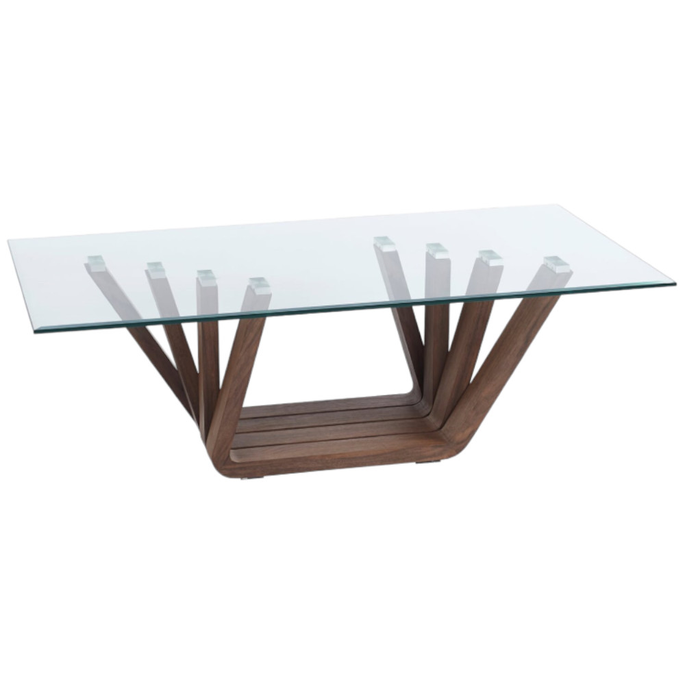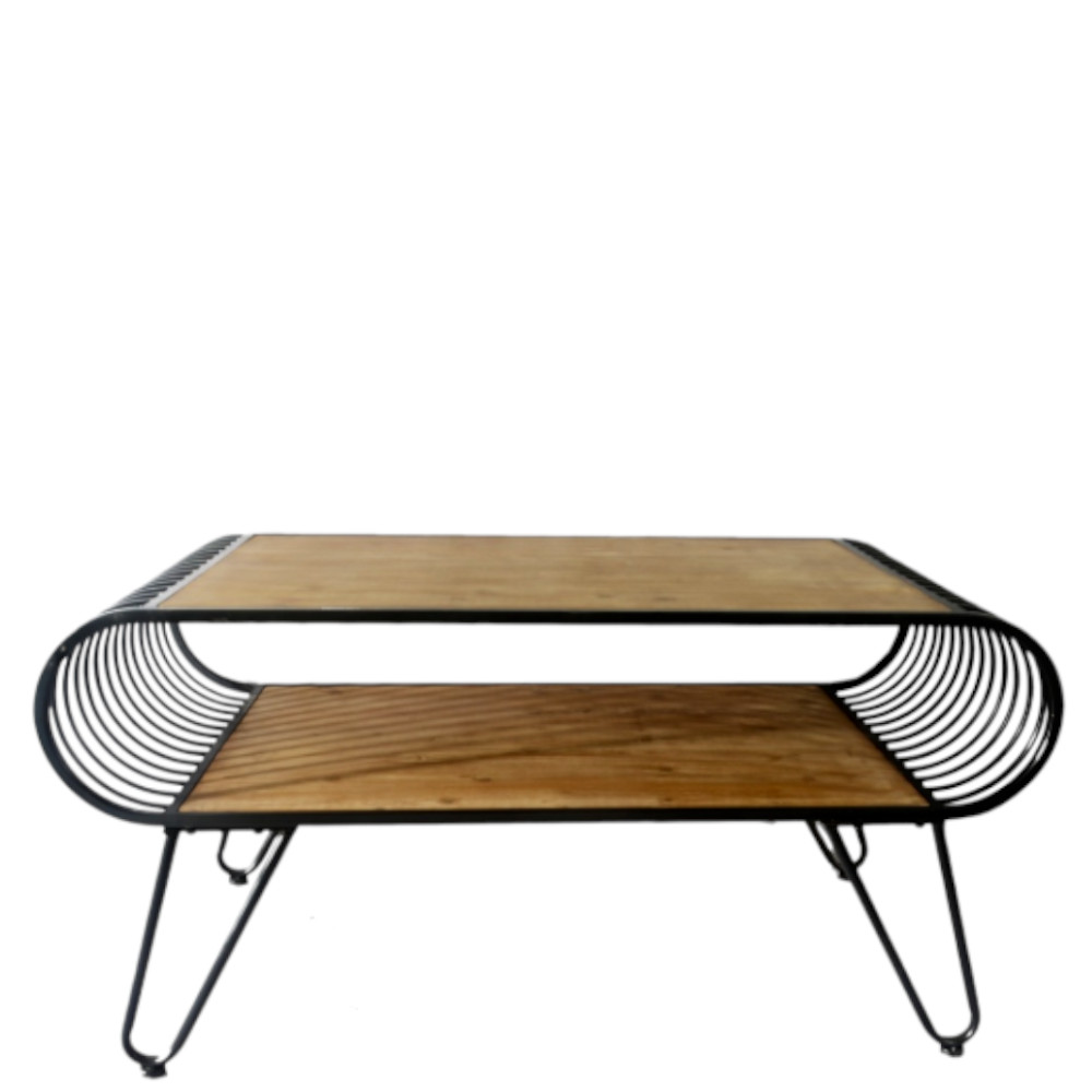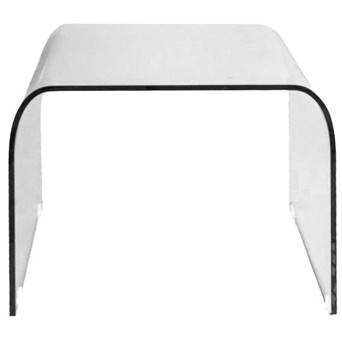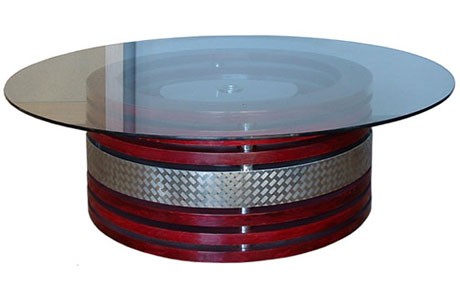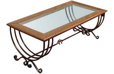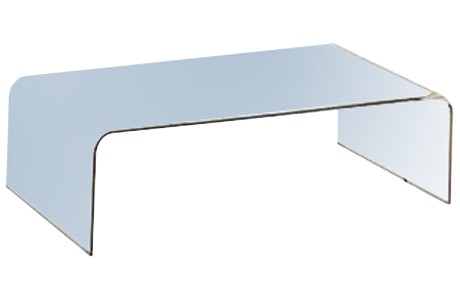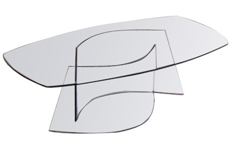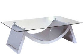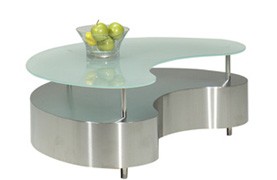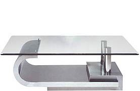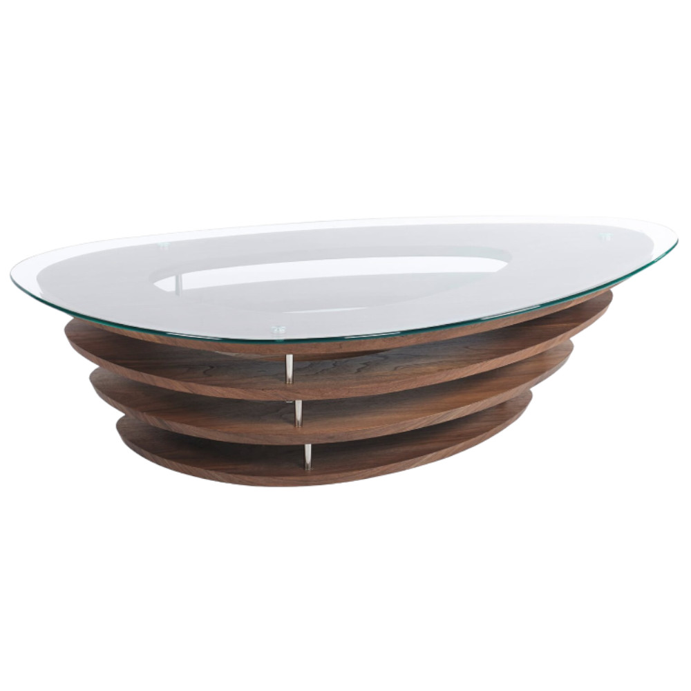 A modern coffee table featuring a floating glass on a thick stainless steel arc with a wooden co..