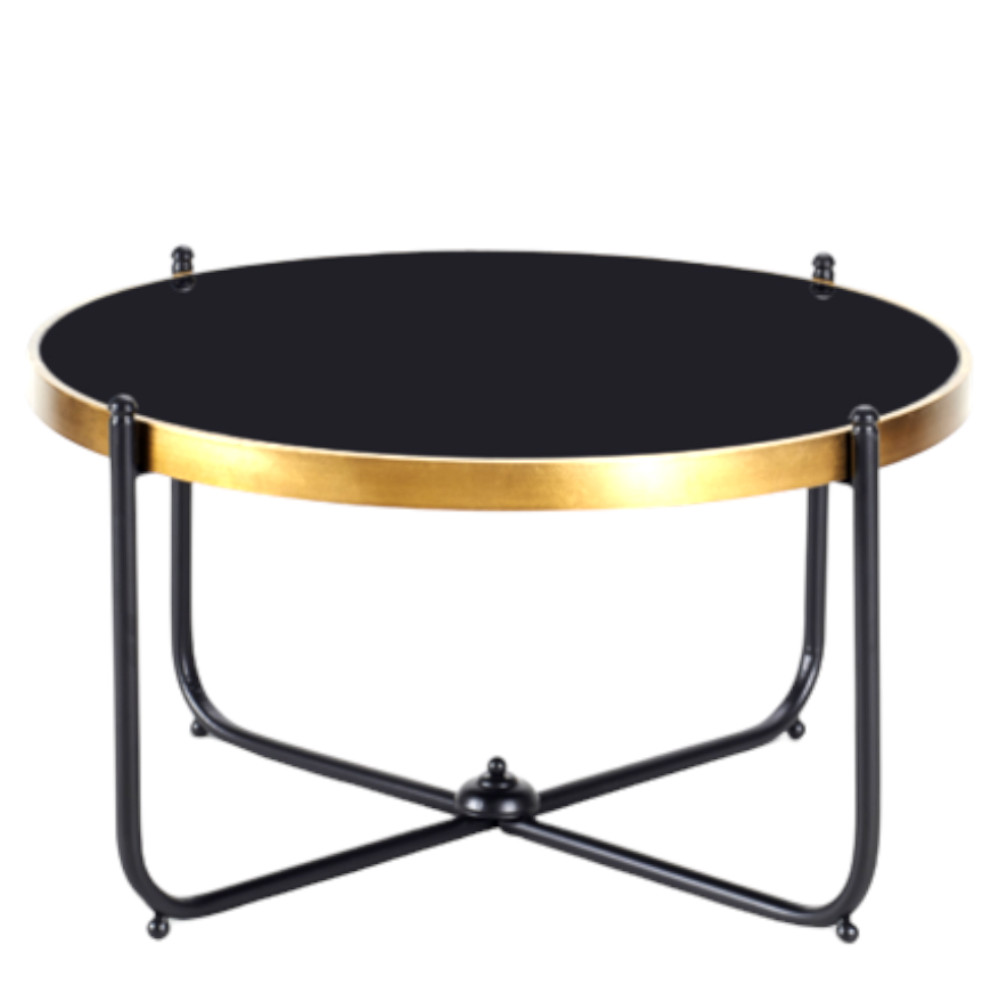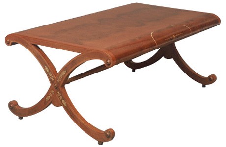 A rectangular coffee table with rounded sides and cross-legs with gilded detail...
