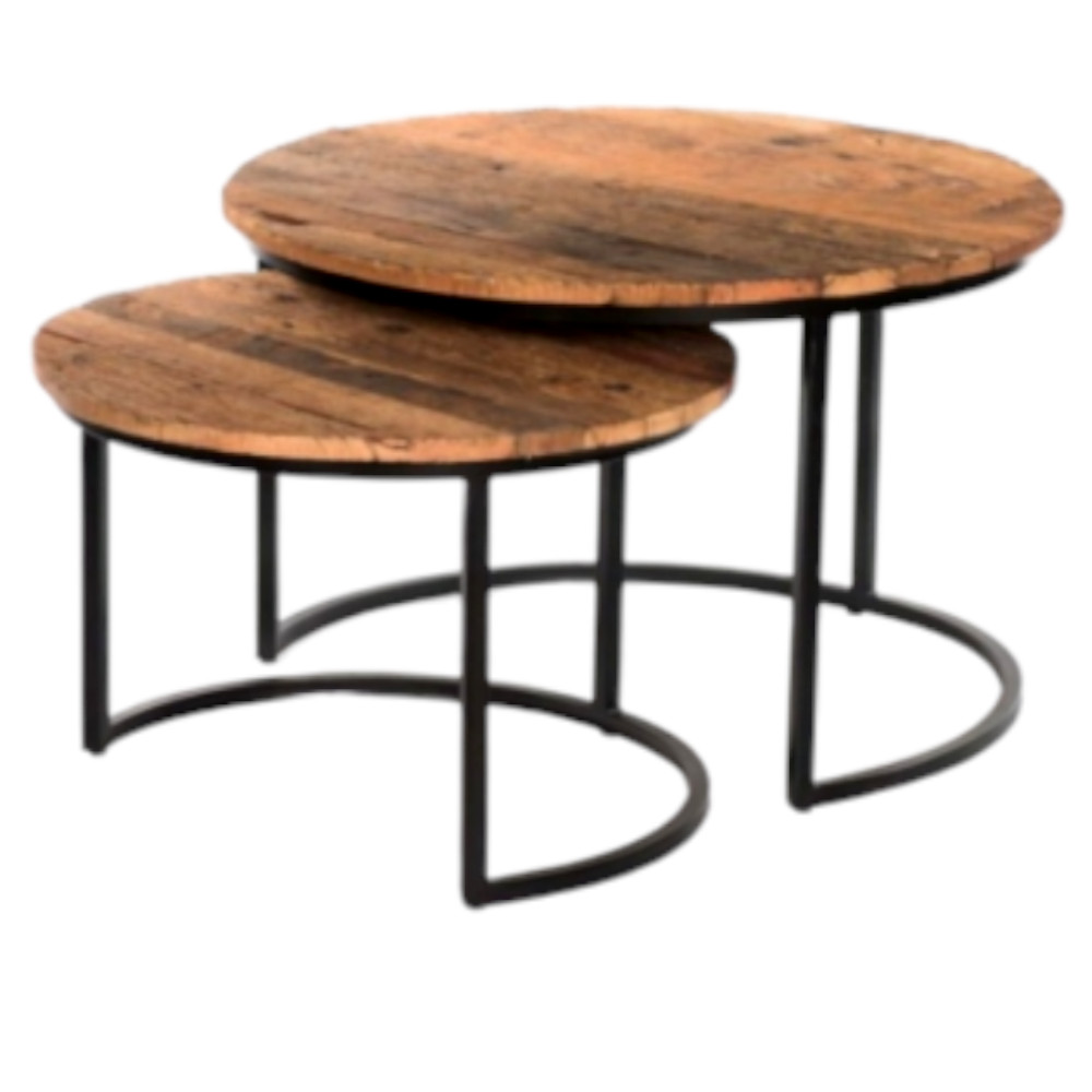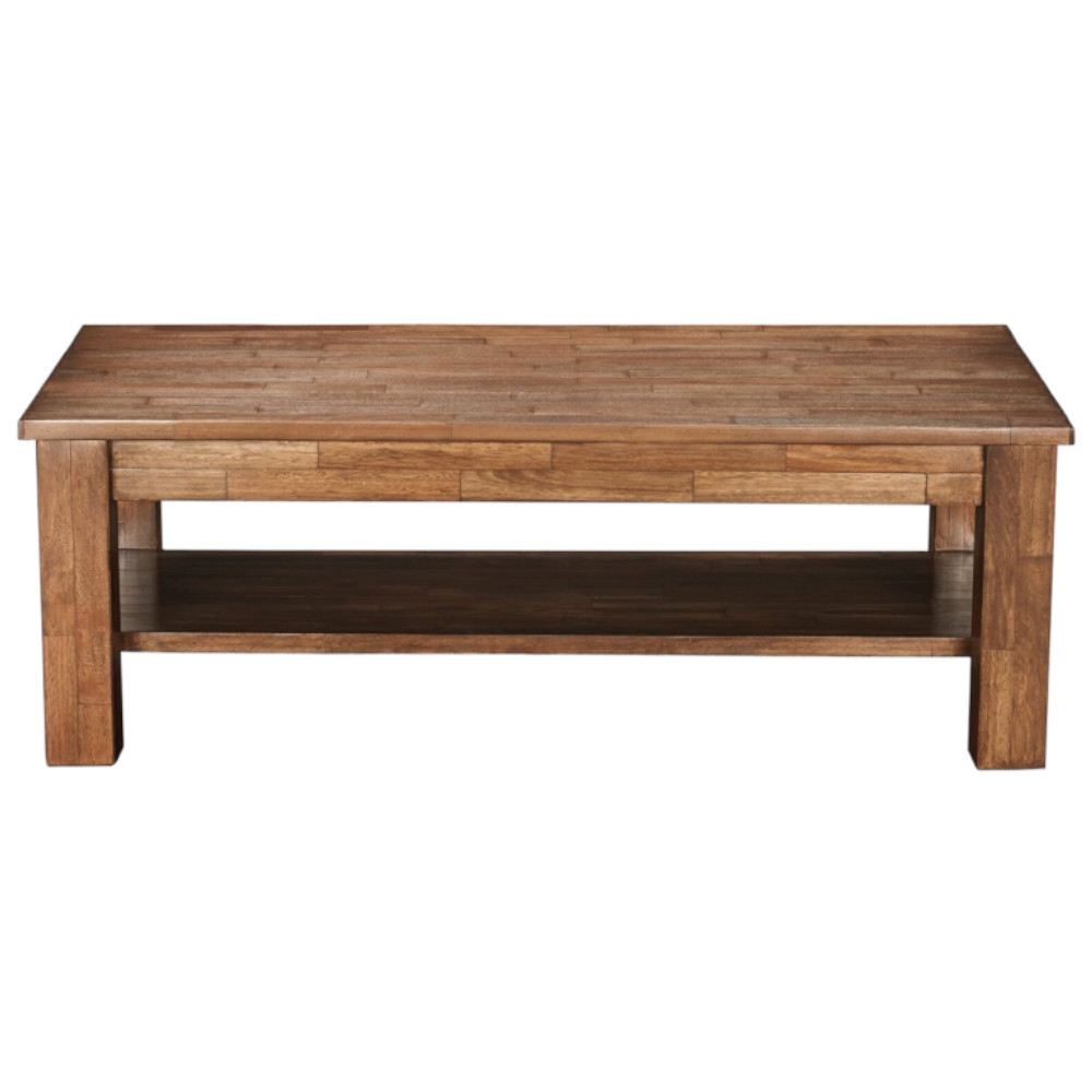A coffee table with a chunky wooden top floating off four square stainless steel legs...