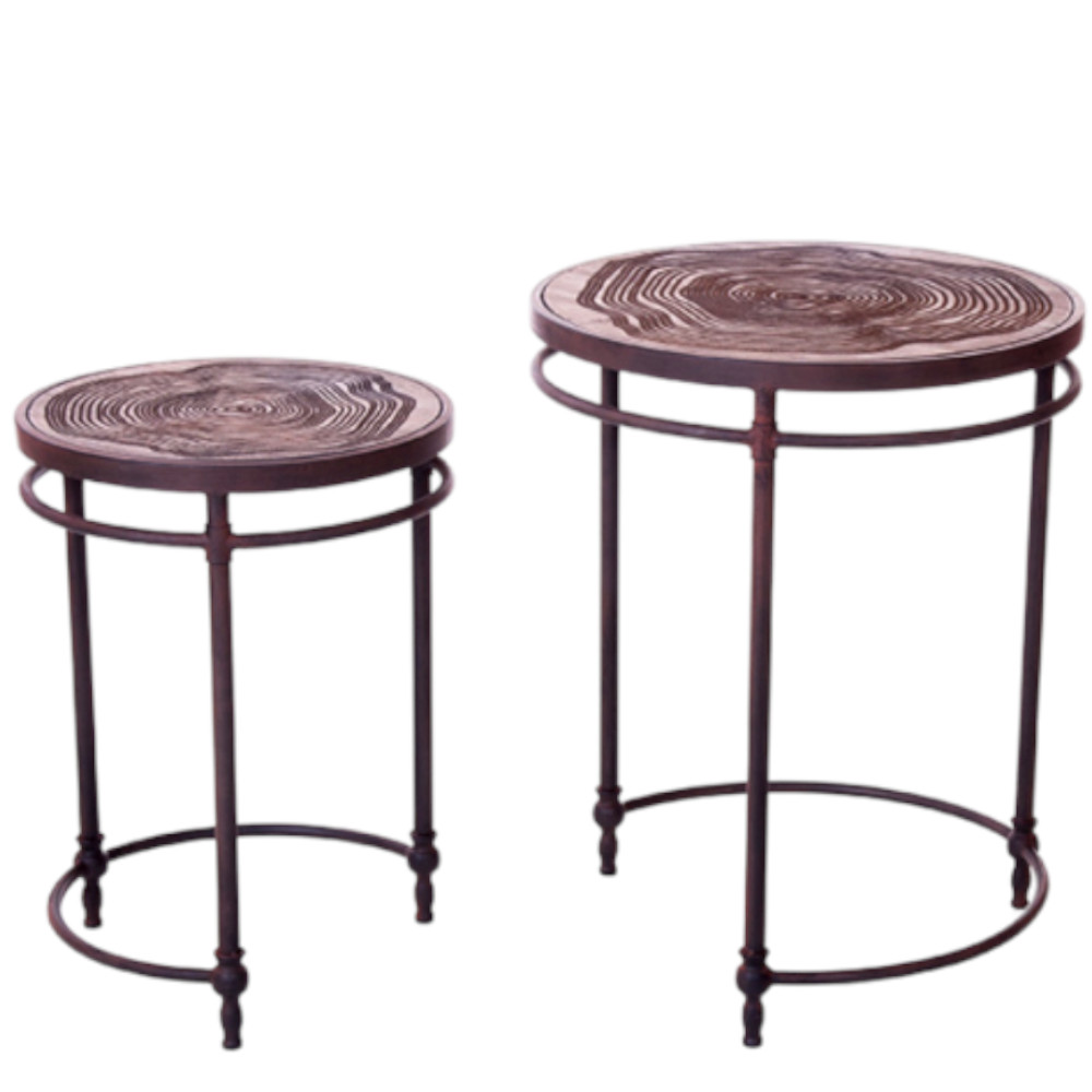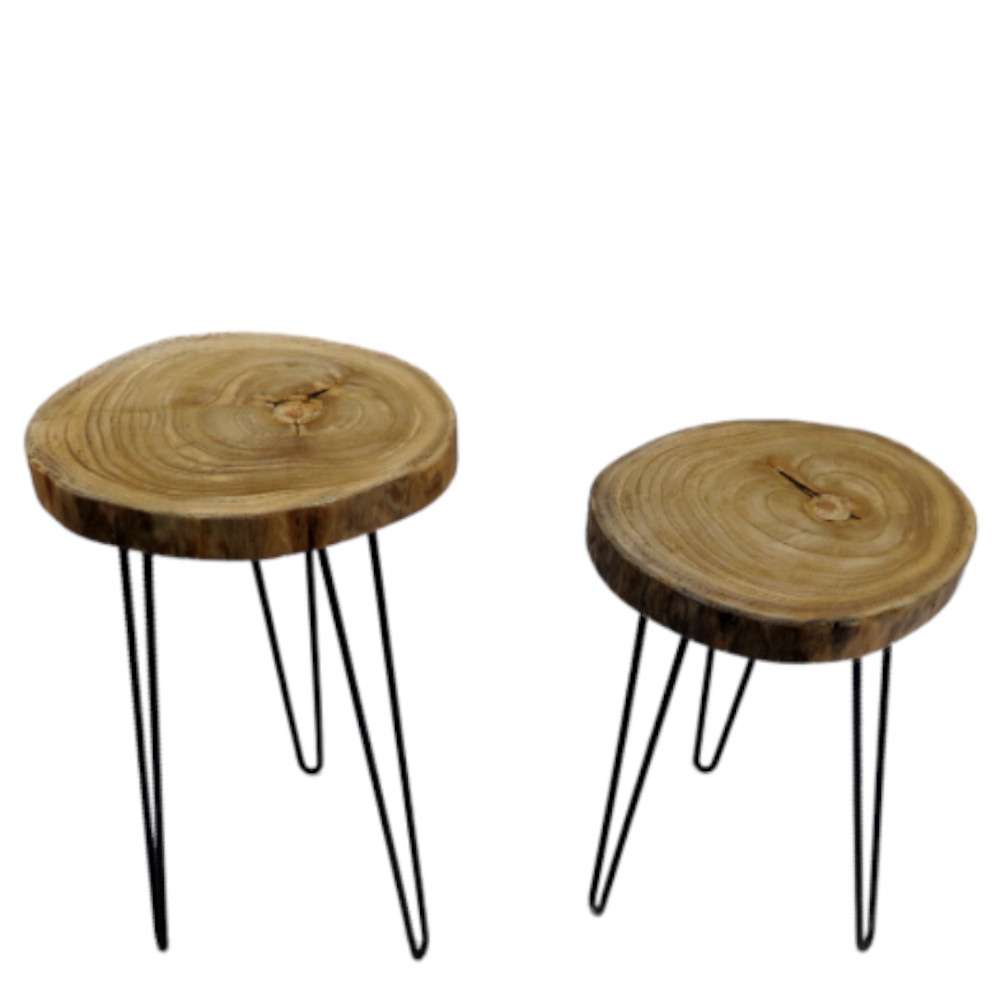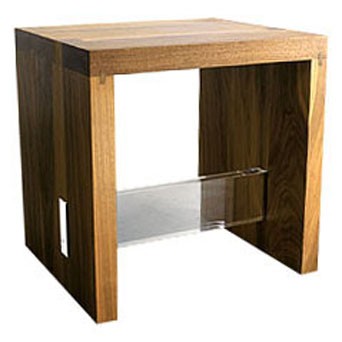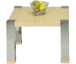 A lamp table with a chunky wooden top suspended from four square stainless steel legs...