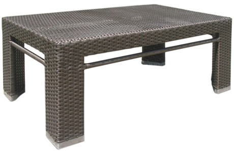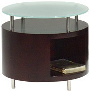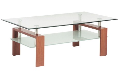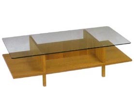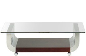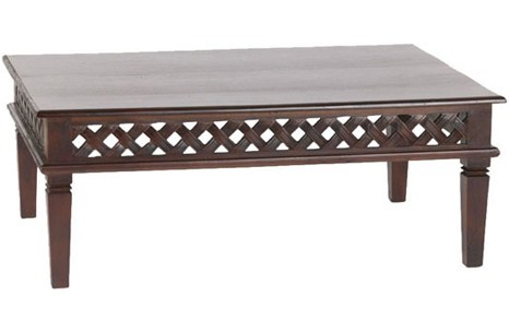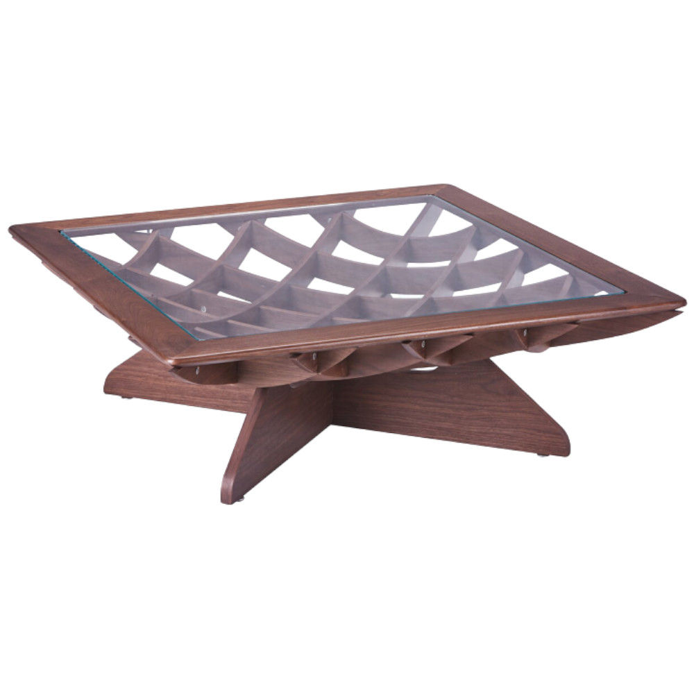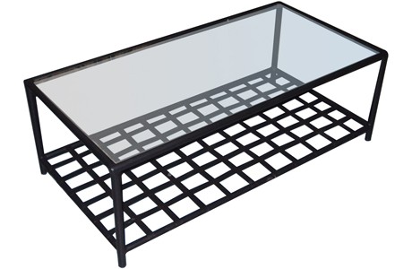 A contemporary coffee table with a wood framed glass top and a lattice magazine shelf. Available in ..