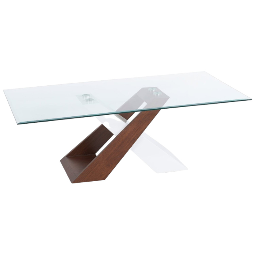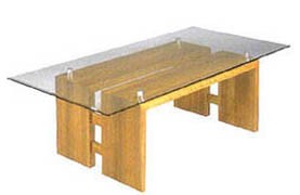 A geometrically styled coffee table with two wooden L-bars supporting a triangular glass top...