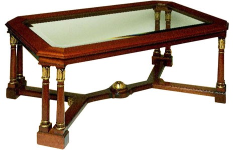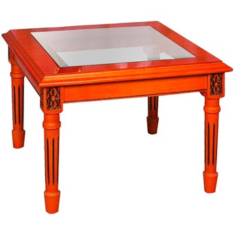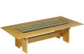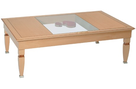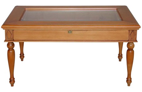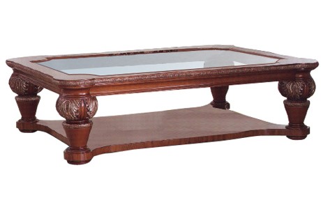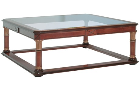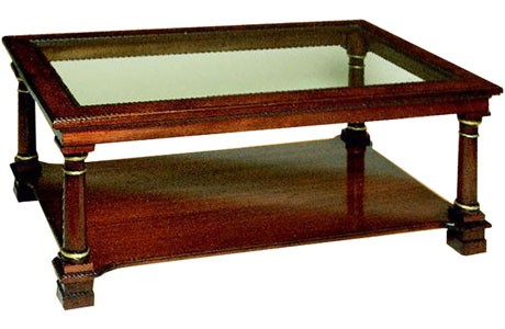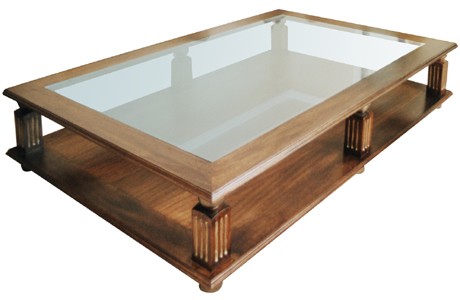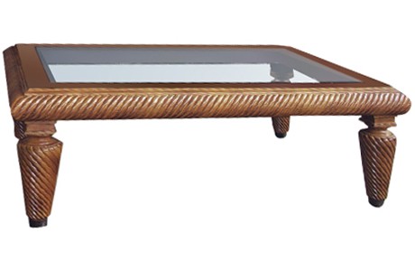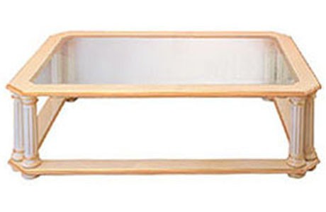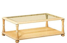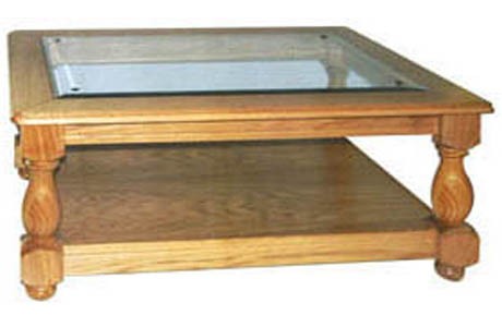 A solid wood coffee table with turned legs and a framed glass top. Available in a range of sizes and..