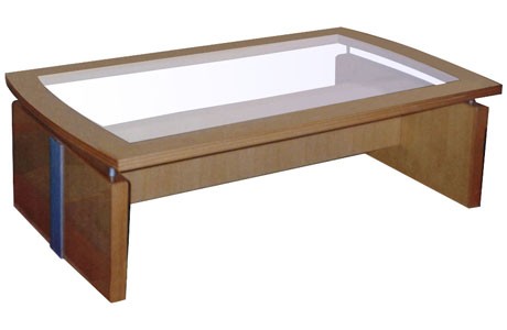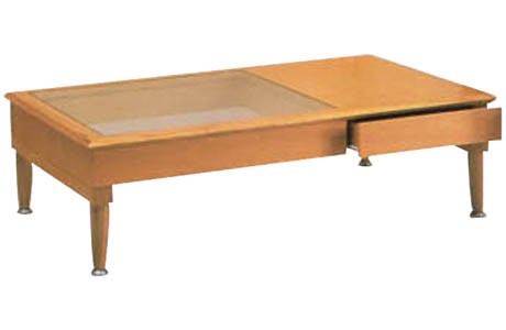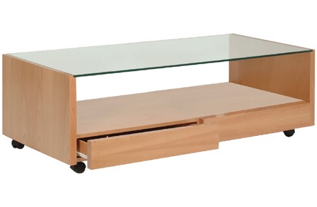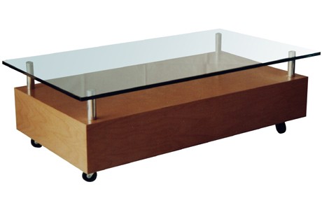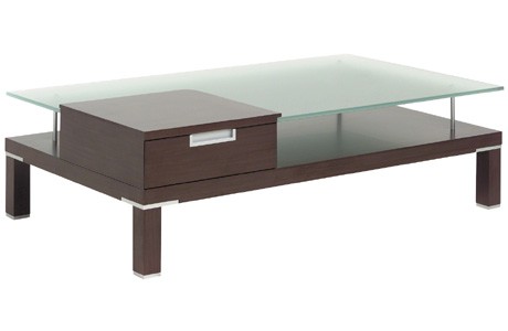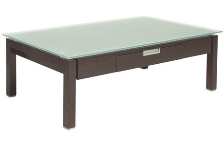 A simplistic coffee table with an integrated drawer and a sandblasted glass top...