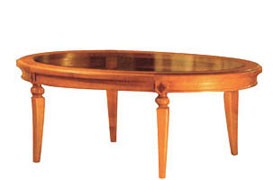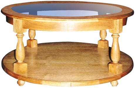 An oval solid wood coffee table with turned legs and a framed glass top. Available in a range of siz..