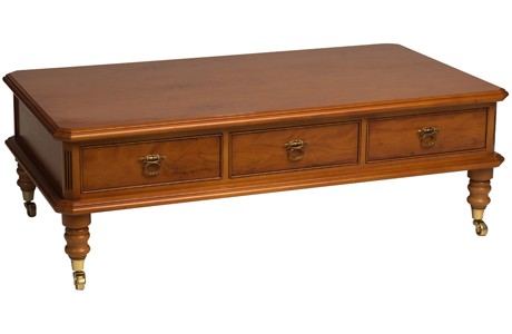 A three drawer wooden top coffee table with turned legs on optional castors. Available in variou..