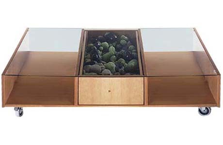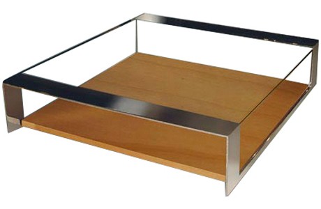 A coffee table with a glass top floating above four layered stainless steel cubes attached to a wood..