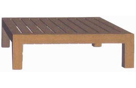 A simplistic low coffee table with a slatted top and square parsons legs...