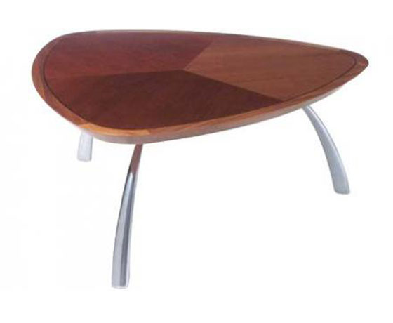 A triangular coffee table with curved stainless steel legs bonded onto a wooden top with cross-g..